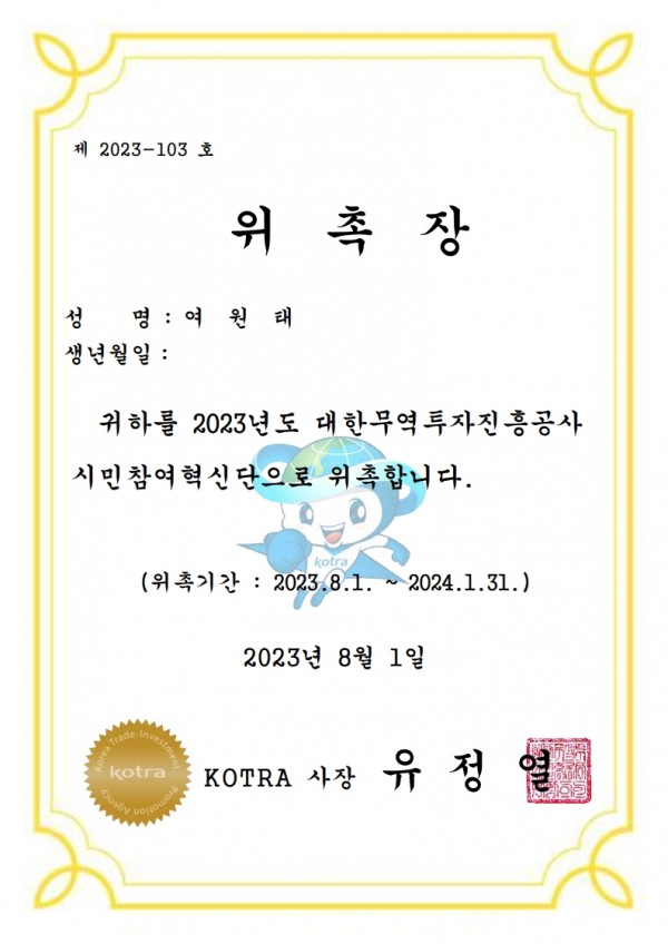 Letter of Appointment of KOTRA Citizen Participation Innovation Group 관련링크 mondereve 105 0 본문 Letter of Appointment of KOTRA Citizen Participation Innovation Group SHARE THIS PAGE 목록